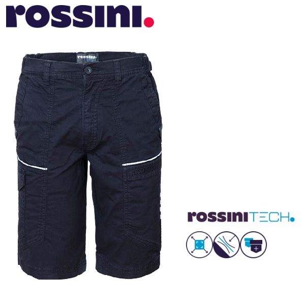 Bermuda da lavoro multitasca in cotone twill elasticizzato, con elastici laterali e passanti in vita, chiusura con zip e bottone.