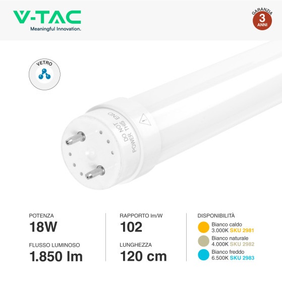 V-Tac VT-1221 è un tubo LED da 18W di potenza con attacco G13 e tecnologia LED SMD. La loro forma a tubo T8 è realizzata in vetro e la loro copertura è a finitura opaca. Con fascio luminoso di 160° e flusso luminoso di 1850 lm, queste lampade ad alta luminosità hanno un rapporto di 102 lm/W.