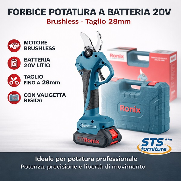 Ronix 8660 è un potente potatore a batteria brushless da 20 V progettato per un taglio preciso e senza sforzo. Dotato di un motore brushless da 600 W e una capacità di taglio massima di 28 mm, offre tagli lisci e puliti senza danneggiare i rami. Il suo design leggero da 1,15 kg, l’impugnatura ergonomica e la lama SK5 di alta qualità garantiscono prestazioni professionali per la potatura di alberi, viti e la manutenzione generale del giardino.