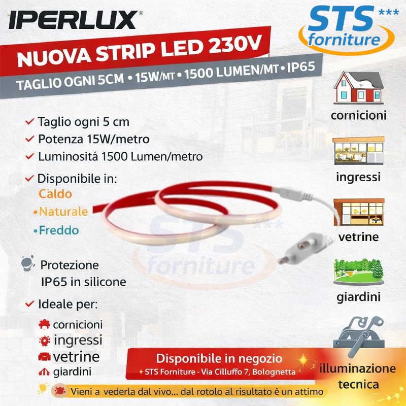 Strip LED COB 230V 15w/mt Luce Fredda 1350 Lumen/mt IP65